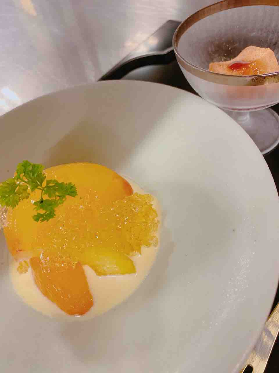 今日のデザートは桃のコンポートと、きび餅✨