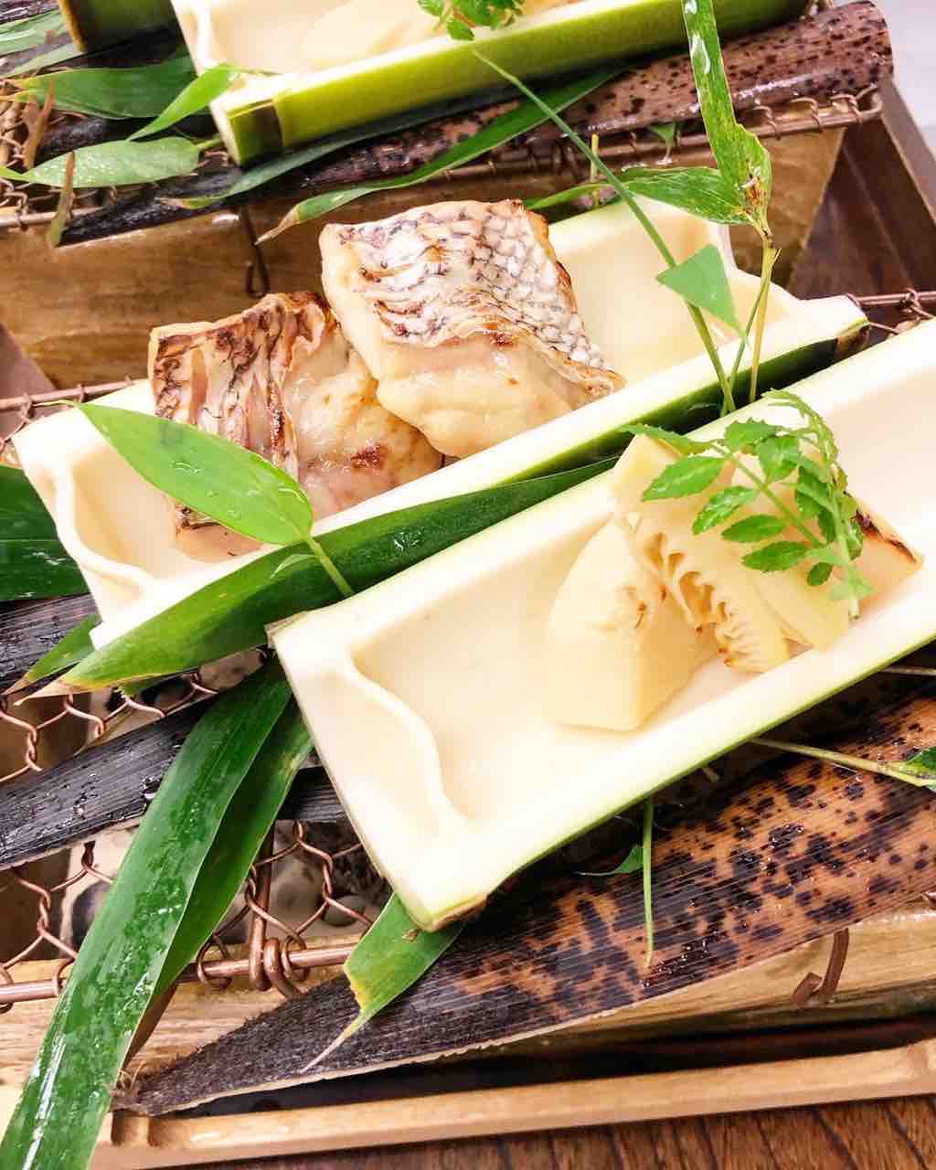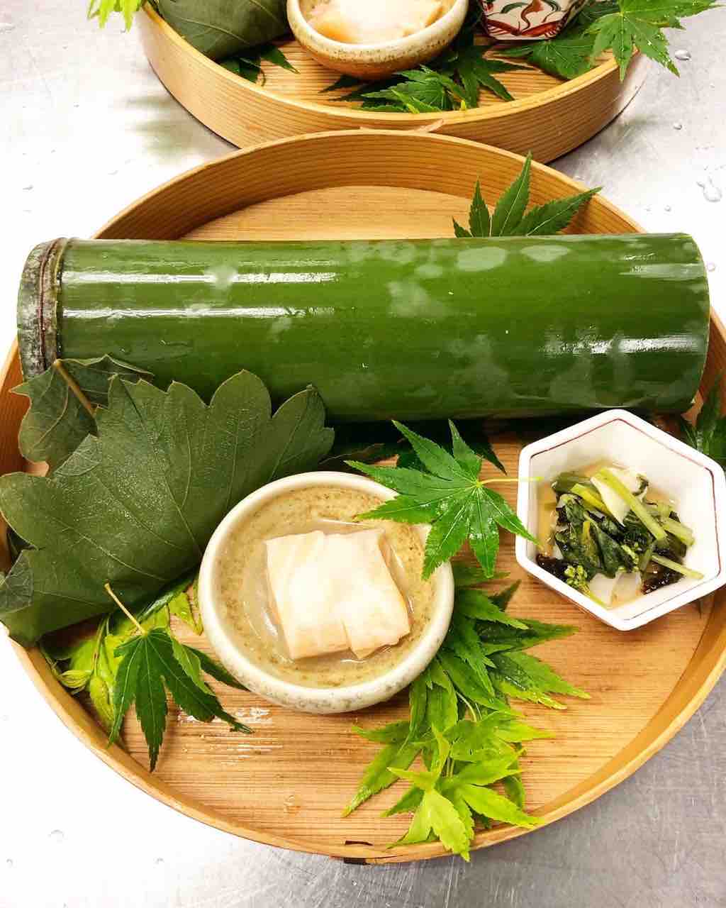 板長が切り出して作った竹の器です