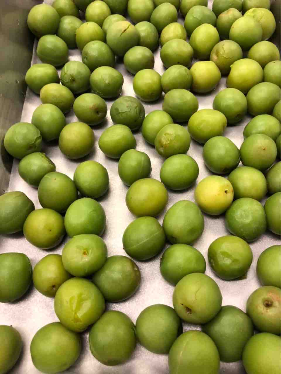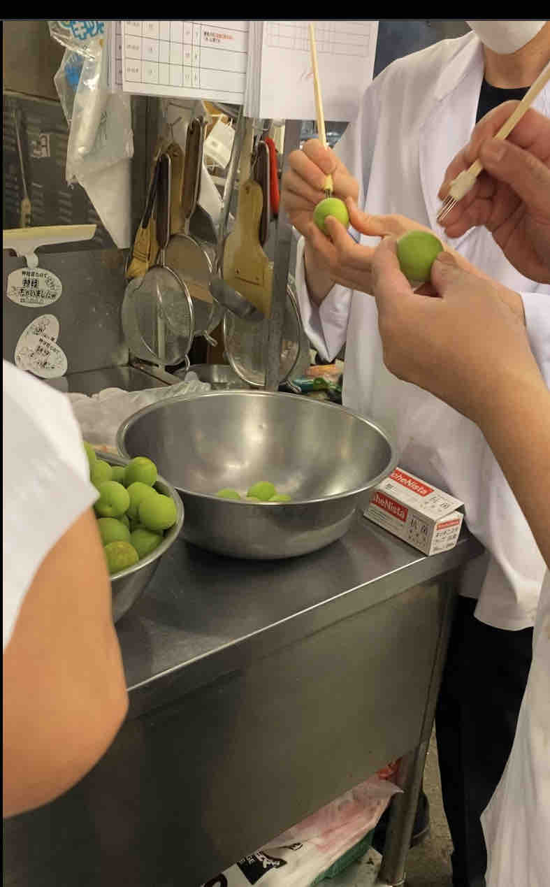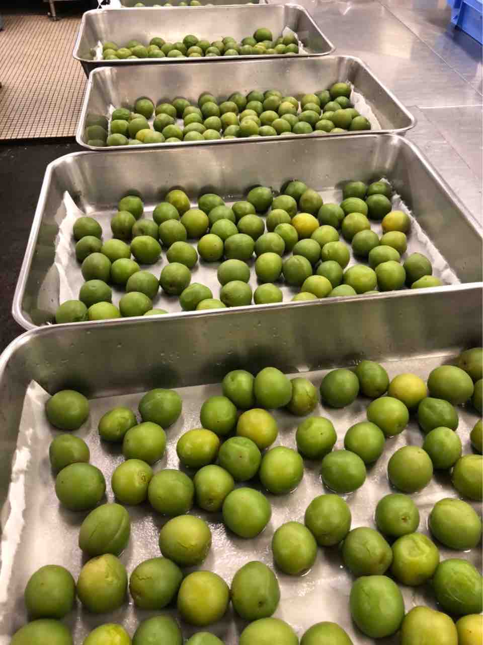 3日かけて作ります。まずはプチプチぷちぷち全面にびっしり細い針を打ち込みます。水から入れて80度の湯でゆっくり湯がきます。水に1日さらします。 蜜をわかしてそこに漬けます。(水、グラニュー糖、氷砂糖) 1日漬けたのをバットにあげます。 鍋に残った蜜にグラニュー糖、氷砂糖を入れて温めてからブランデーを投入。それを瓶詰めにして 梅をもどして出来上がり~ 柔らかいのなんのって口に入れた瞬間溶けます。3秒でなくなります。 7月の献立の八寸に登場します。 お楽しみに