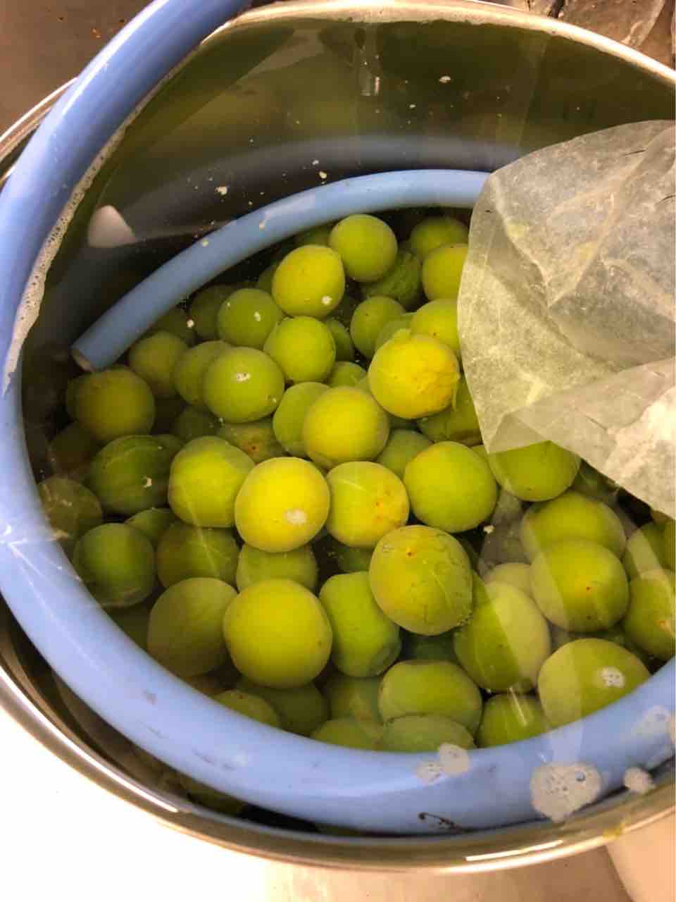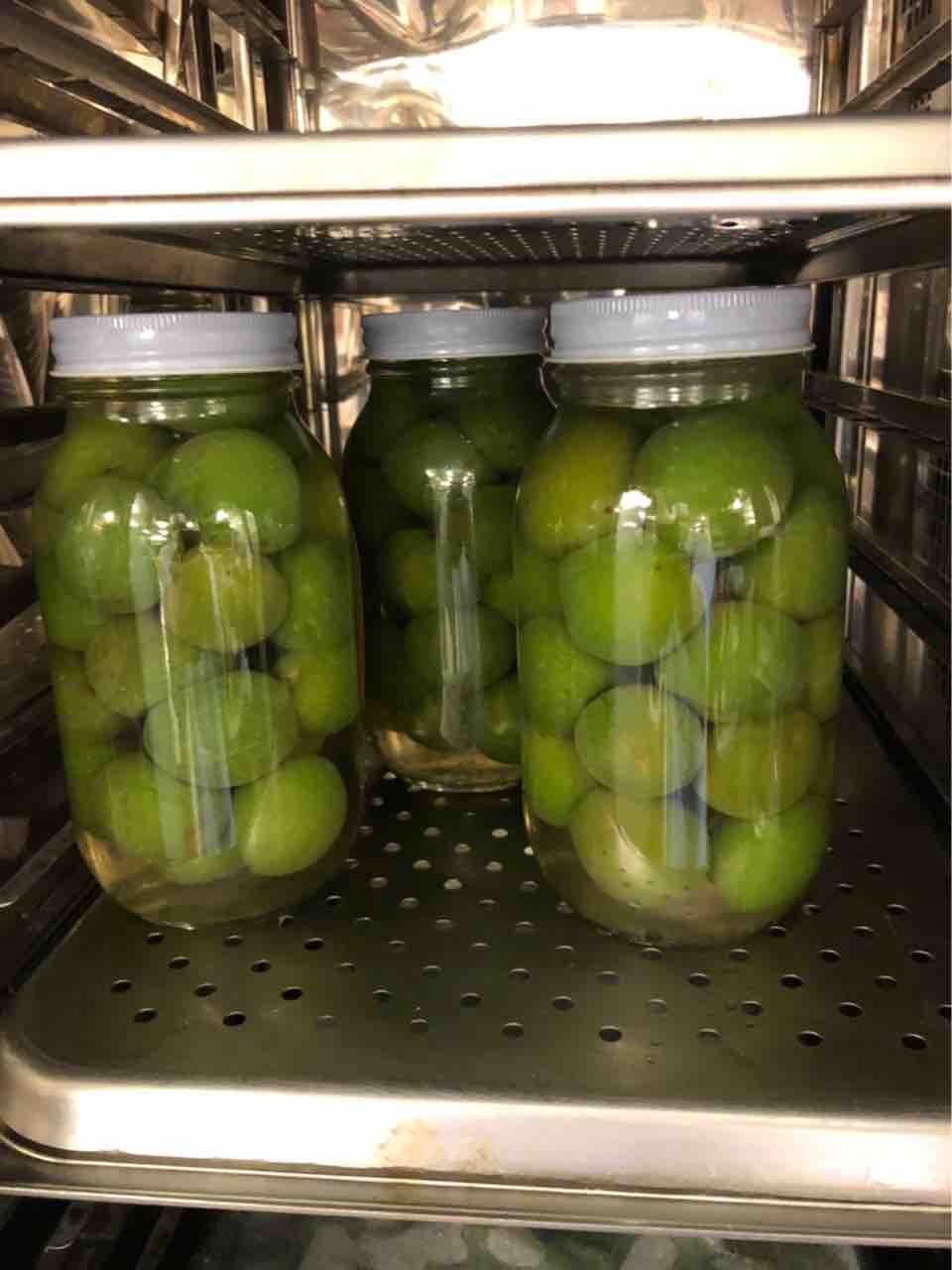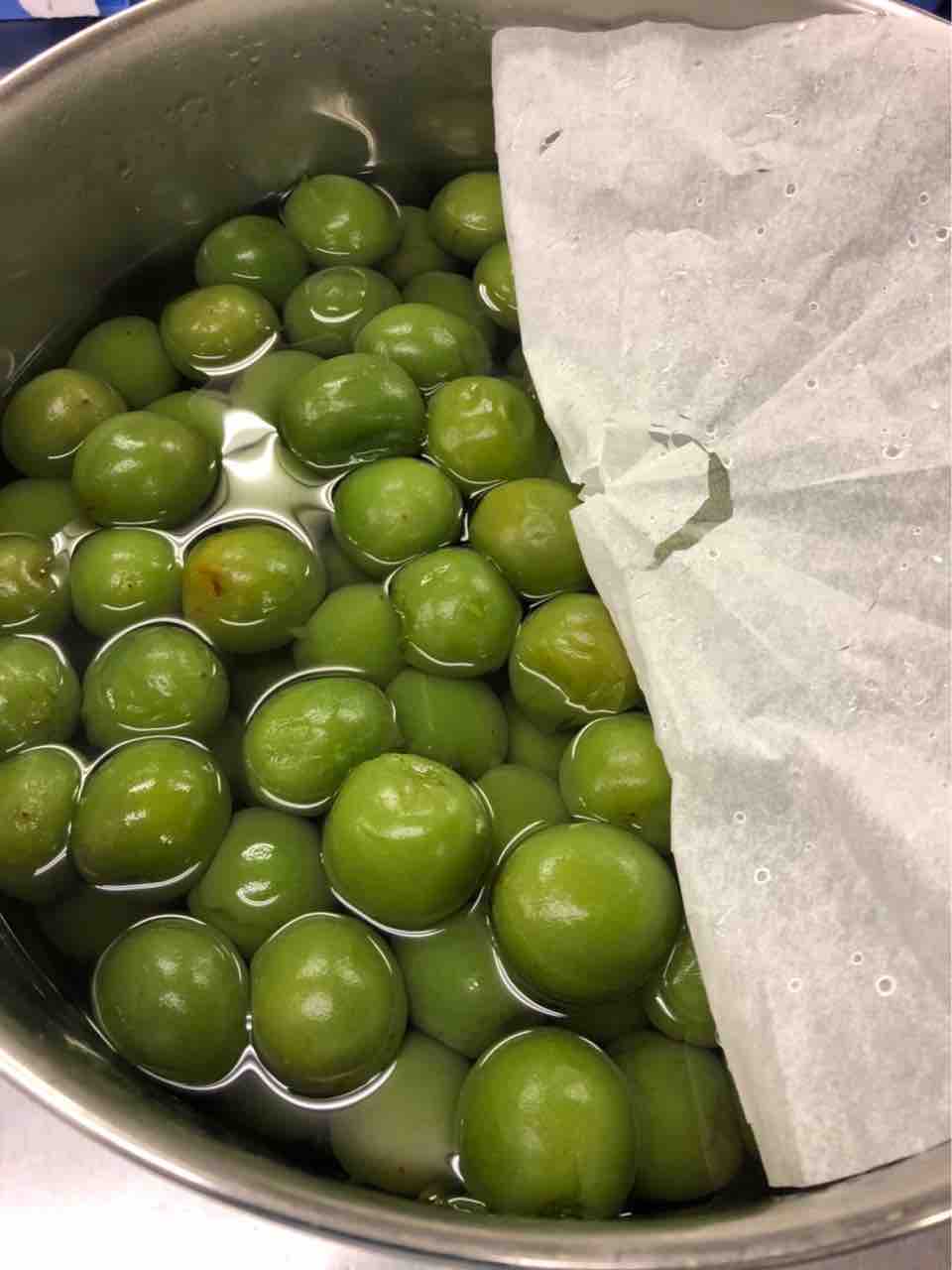 3日かけて作ります。まずはプチプチぷちぷち全面にびっしり細い針を打ち込みます。水から入れて80度の湯でゆっくり湯がきます。水に1日さらします。 蜜をわかしてそこに漬けます。(水、グラニュー糖、氷砂糖) 1日漬けたのをバットにあげます。 鍋に残った蜜にグラニュー糖、氷砂糖を入れて温めてからブランデーを投入。それを瓶詰めにして 梅をもどして出来上がり~ 柔らかいのなんのって口に入れた瞬間溶けます。3秒でなくなります。 7月の献立の八寸に登場します。 お楽しみに