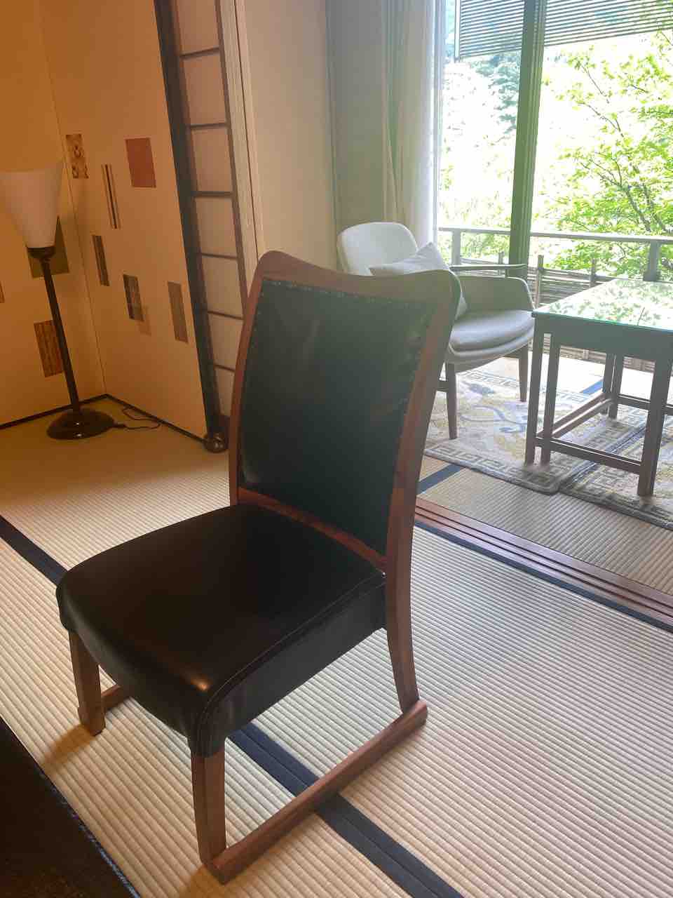 どのお部屋に泊まられても畳の上に椅子テーブルセッティングできます。この椅子は自称ではなく妻称、椅子研究家(椅子オタクとも言う)の夫が開発してBS工房さんで作りました。 畳を傷つけない足座面には小さなコイルが沢山入っていて長時間座っても快適です。 座布団に座っての和食はいいものですが足に負担がかかりますのでご希望の方は遠慮なくお申し付けくださいませ