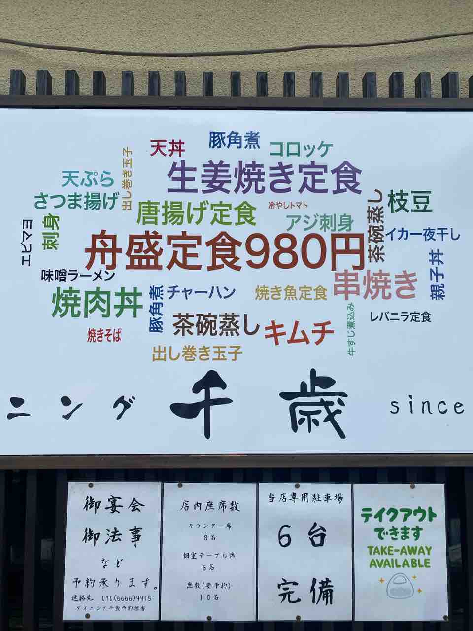 千歳川沿いガード下の近くにある「ダイニング千歳」舟盛定食980円!ピッカピカ綺麗なお刺身でした。 アジフライ定食何と大間のマグロが880円で食べられました✨写真を撮り忘れて途中から慌てて撮りました他の人がラーメン食べててそれもとても美味しそうで次回はラーメンと半チャーハンと心に決めている私です。(お店の裏に駐車場も有)