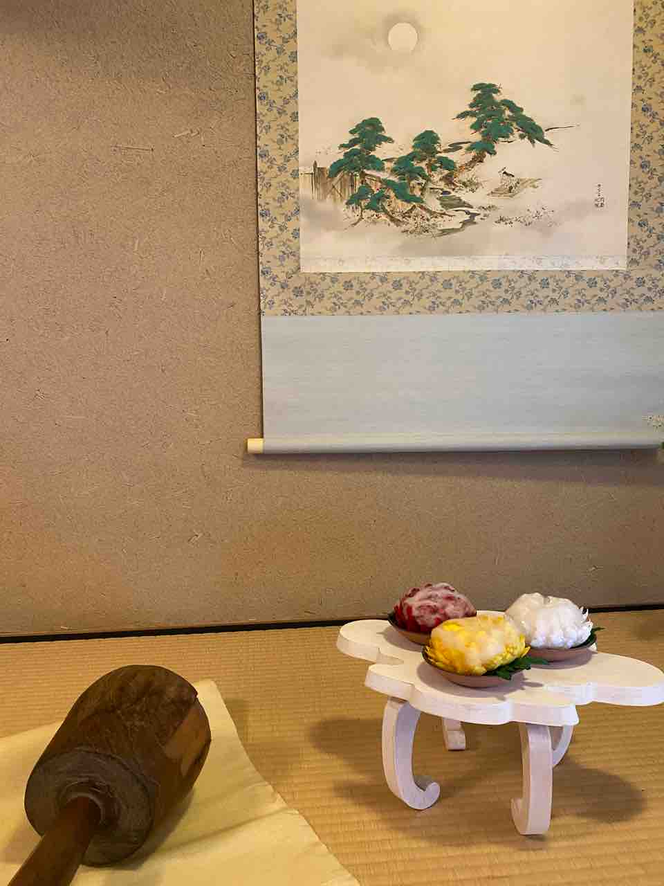 9月9日は救急の日そしてケンタッキーのカーネルおじさんのお誕生日だそうですが長寿を祝う重陽の節句です。 玄関には朝露をイメージした白綿をかぶった菊をかざりました。 そして左側に見えます木の小槌は、「砧(きぬた)」昔の人が秋の夜長に布を叩いてやわらかくした道具です。掛け軸をよ~く見ると砧を叩いております