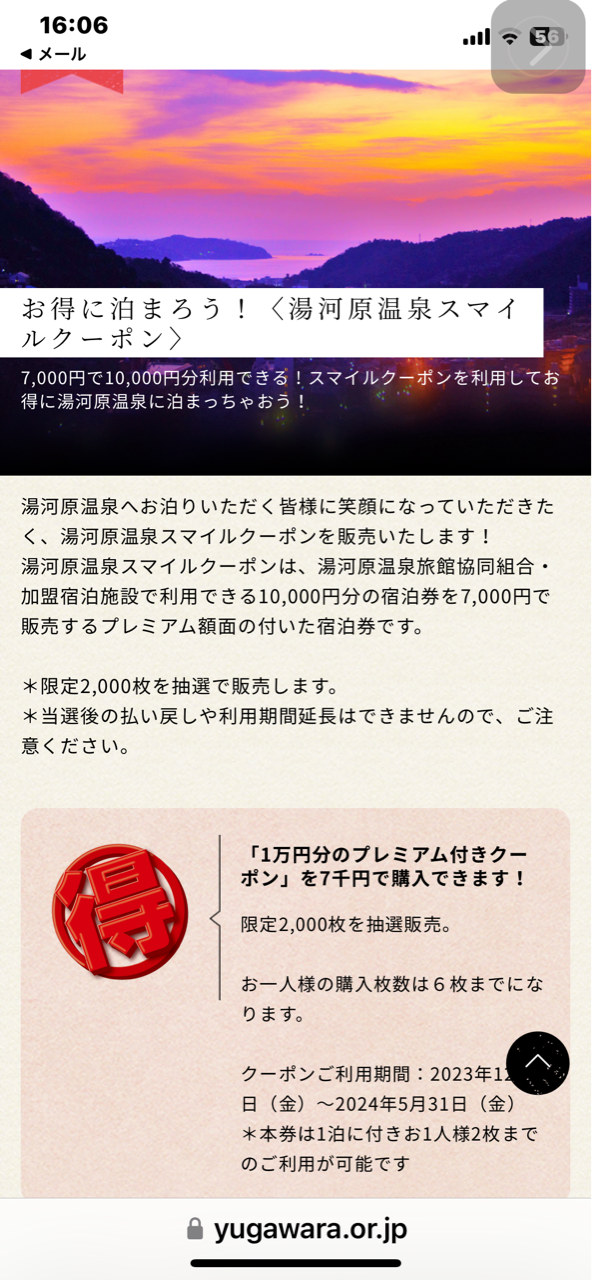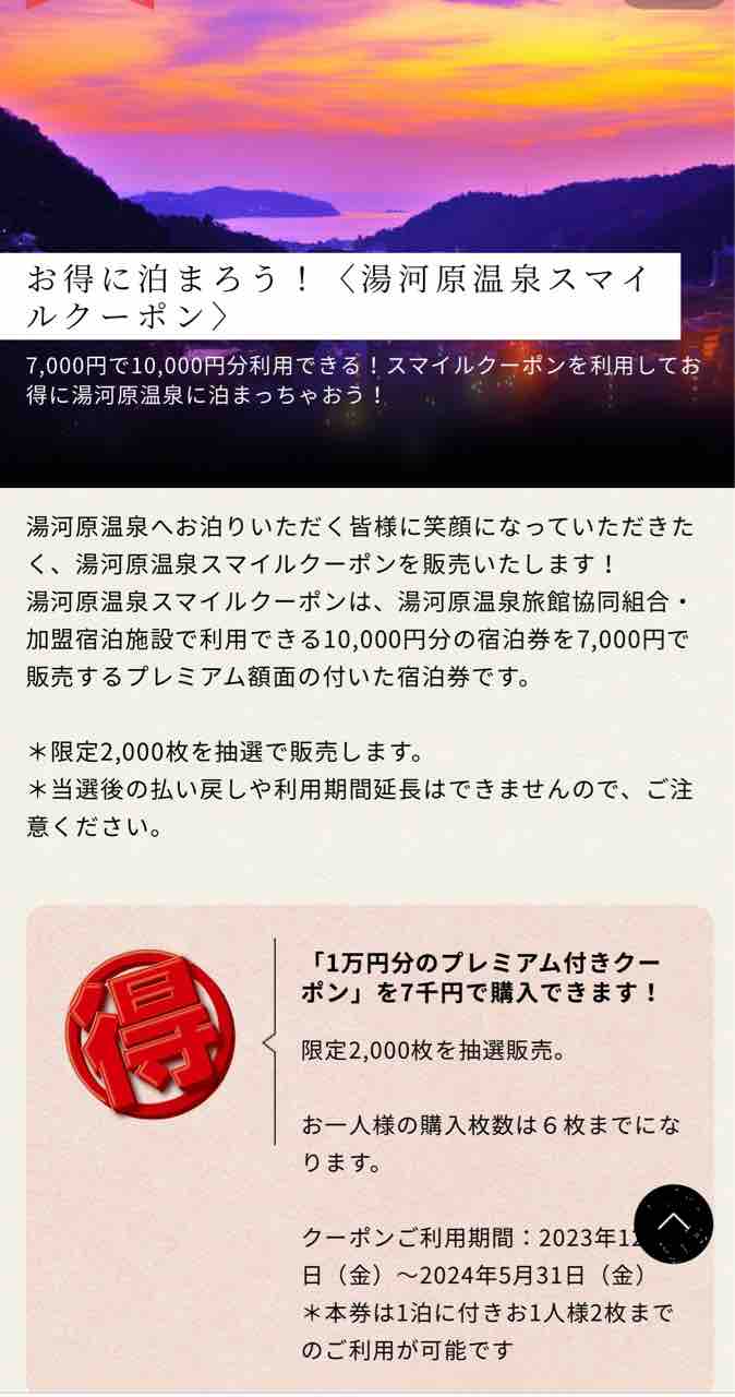 湯河原温泉スマイルクーポンは、湯河原温泉旅館協同組合・加盟宿泊施設で利用できる10,000円分の宿泊券を7,000円で