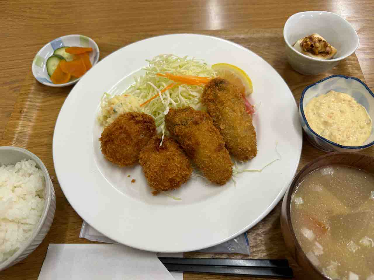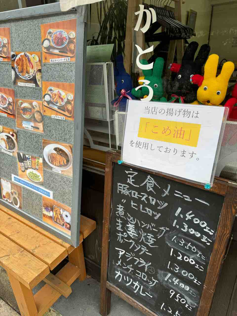 「かとう」で帆立と牡蠣フライ定食を食べてきました。こちらはチキンカツカレー レトロな食堂です。 隣は精肉店なので食事の間に夕食用のトンカツとコロッケそして生餃子を注文して食後に受け取ります。 湯元通りにあります