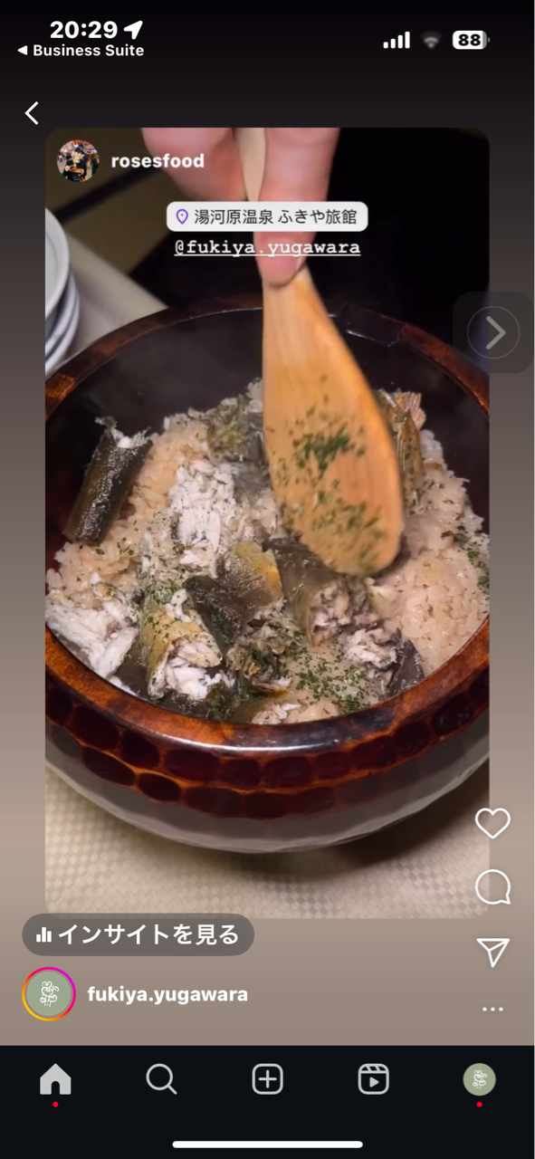 お泊まり頂いた方がインスタのストーリーズにあげてくださいました。富士観光のあとの後半にふきやのお料理が出ます。「ROSESFOOD」彼女のインスタの赤丸を押すと登場します。ストーリーズは24時間経過すると消えてしまうので見て頂けたら嬉しいです