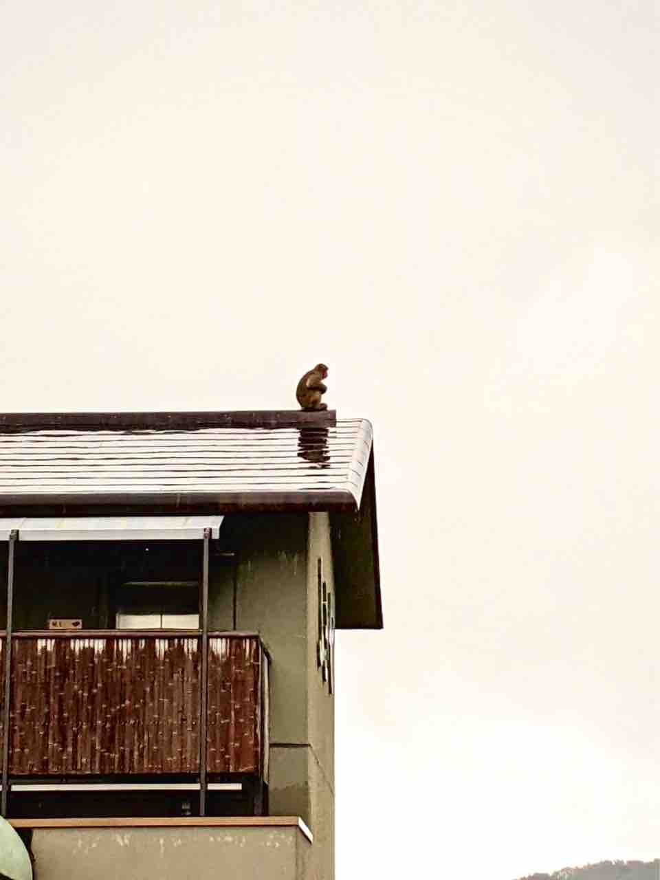台風の影響で東海道線が止まり車も通行規制がかかりました。湯河原ー小田原は、通れたり、通れなかったりと聞いております。 今日チェックアウトして 東京へ帰られたお客様は椿ライン→箱根経由で1号線→小田原から西湘バイパス経由で無事ご帰宅されました。 早くお天気が回復するように祈るばかりです。五所神社より ふきやの屋根から遠くを見つめるお猿さんです