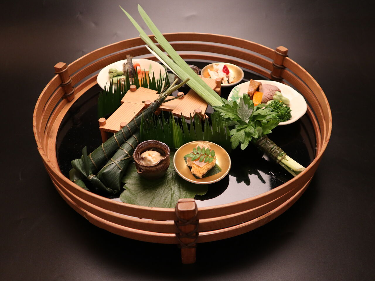 八 寸 端午の節句に因んだ八寸をご用意いたしました。赤飯を笹の葉で包み温かい粽に仕立てました。