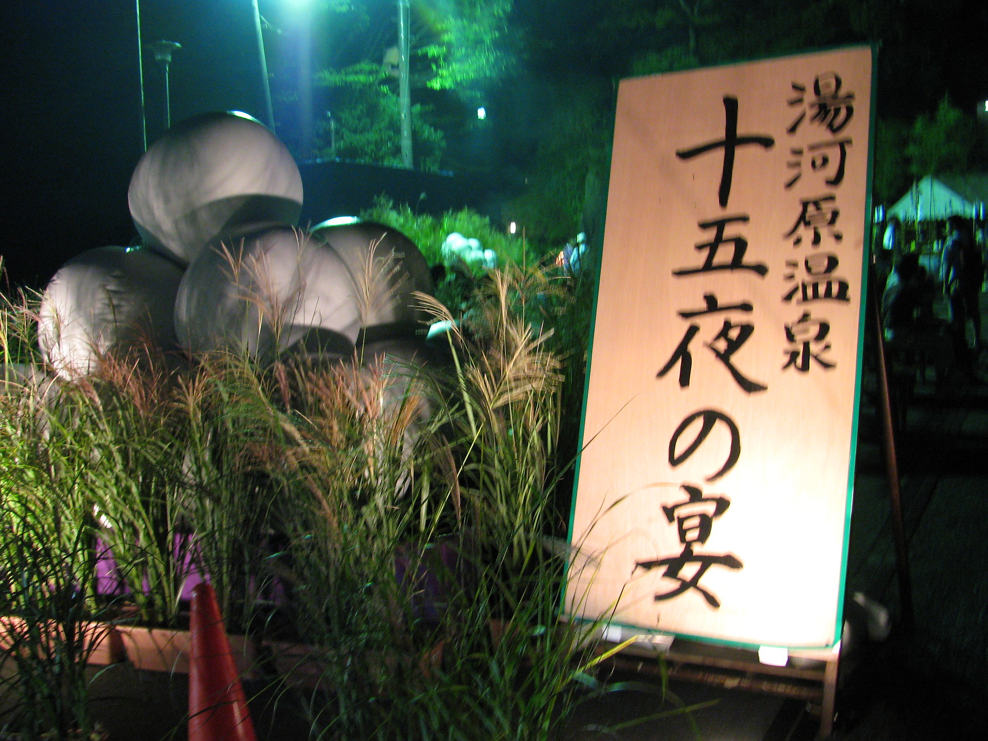 フルートやお琴の演奏を聴いて お団子等をつまみながら 満月を愛しみます。 素敵な夜でしょう? 毎年、観光会館で行っているイベントです。 今年は今日と明日。 私は無料の冷たいお抹茶をお配りしておりました。 巨大お月見団子と炎の上に見える満月は 幻想的でした ところで 毎週木曜日、神奈川新聞のiバザールに 女将が紹介する湯河原温泉の記事があります。 そこでお世話になった神奈川新聞の角田さん 今度はふきやにお立ち寄り下さいませ。 17日は6時からTVK見ますねー