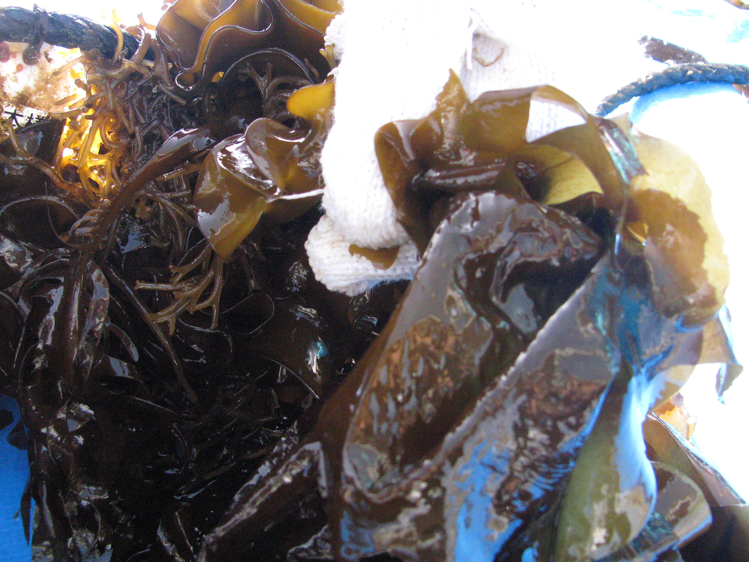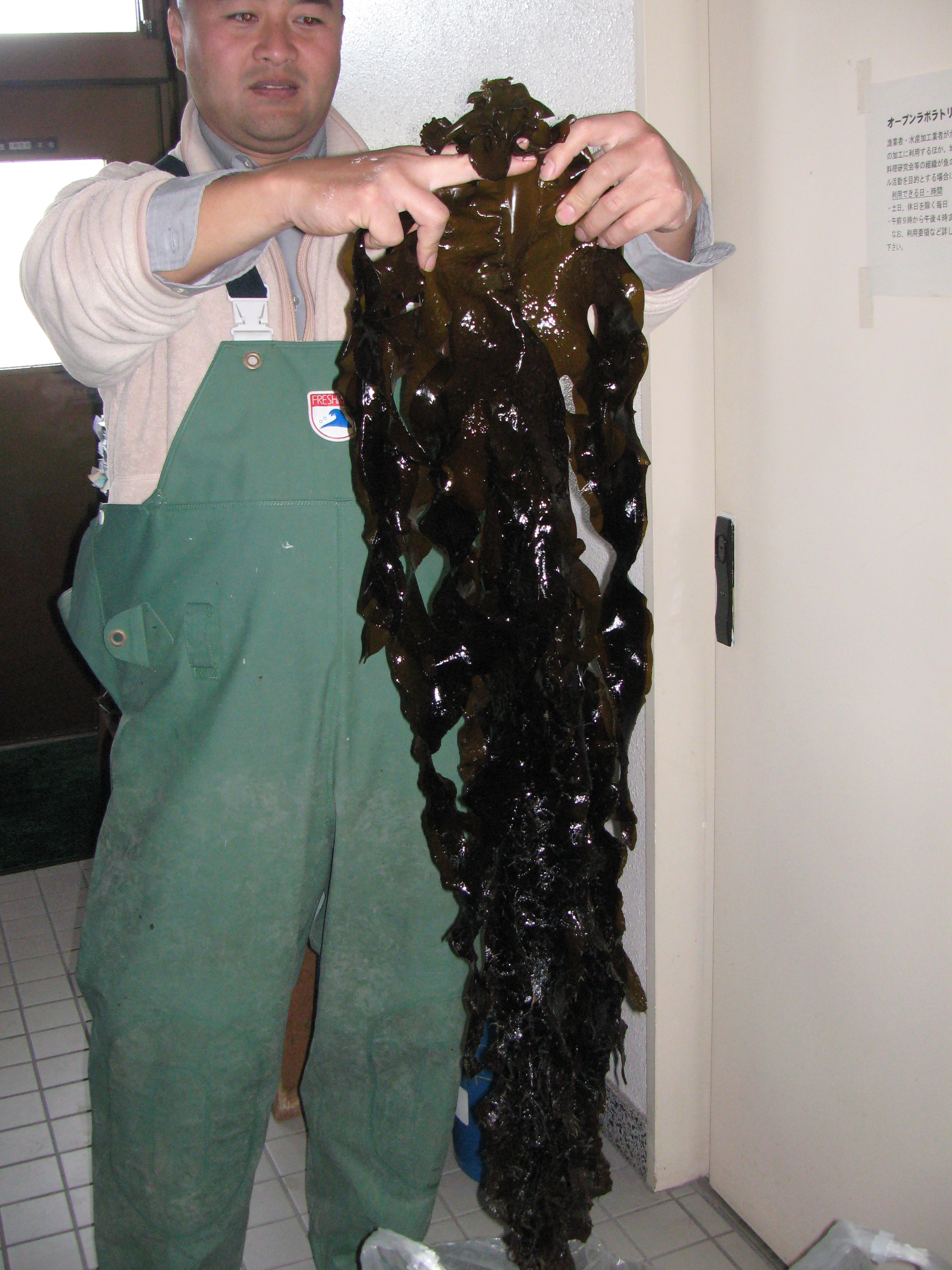 今日はわかめの収穫体験をさせて頂きました。 12月8日 種差 縄にワカメの芽かぶ(胞子を付着させたもの)をつけます。 2月22日 こんなに成長しました。 ズシリ このままではにがりのエグ味があります。 お湯につけるとサッと美味しく鮮やかな色に大変身 保存する場合 塩とカルシウムをまぶします。 ワカメの主成分はアルギン酸 カルシウムと反応して歯ごたえが出ます。 サラダやお味噌汁の他 天ぷらでも 小田原地区では4ケ統でワカメを作っています。