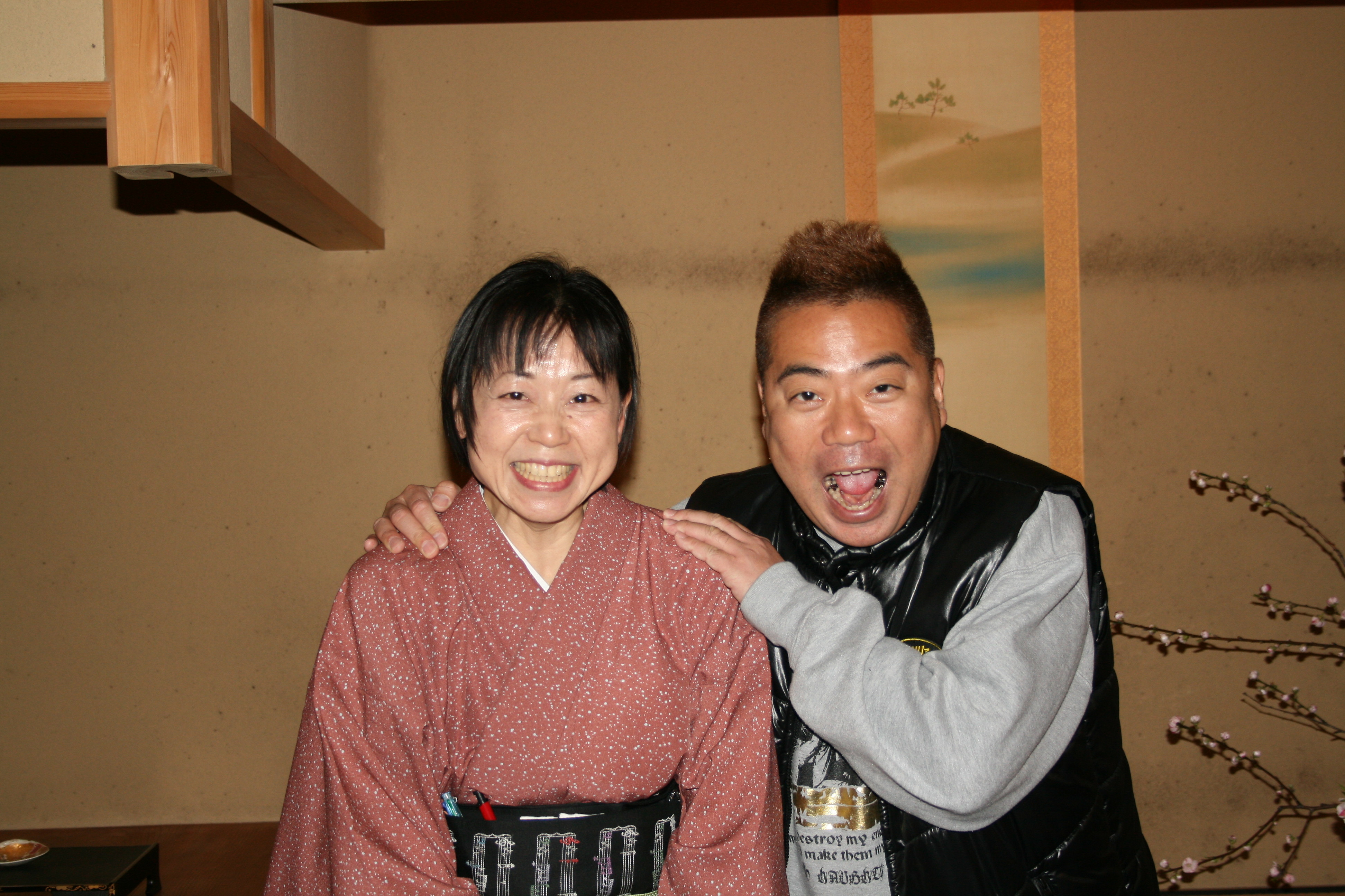 横浜 つた金商店 創業明治27年。老舗の海苔問屋です。 そこのおばあちゃんは97歳 着物をピシッと着て 髪も綺麗に整えてふきやにお越しになります。 このお年でこんな素敵なおばあちゃんは なかなかいないと思うんです。 また、お孫さんが優しくて 親子3代仲良しの光景は 見ていても楽しくなります そのお孫さんとは・・・ じゃーん 出川哲朗さんでした。 (「かっこいい写真にしたいんですけど・・・」 って言ったら、一瞬困った感じでした) 実はおぼっちゃまなんです。 サービス精神があって カメラを向けるとすぐにポーズ (仲居のてるさんと)