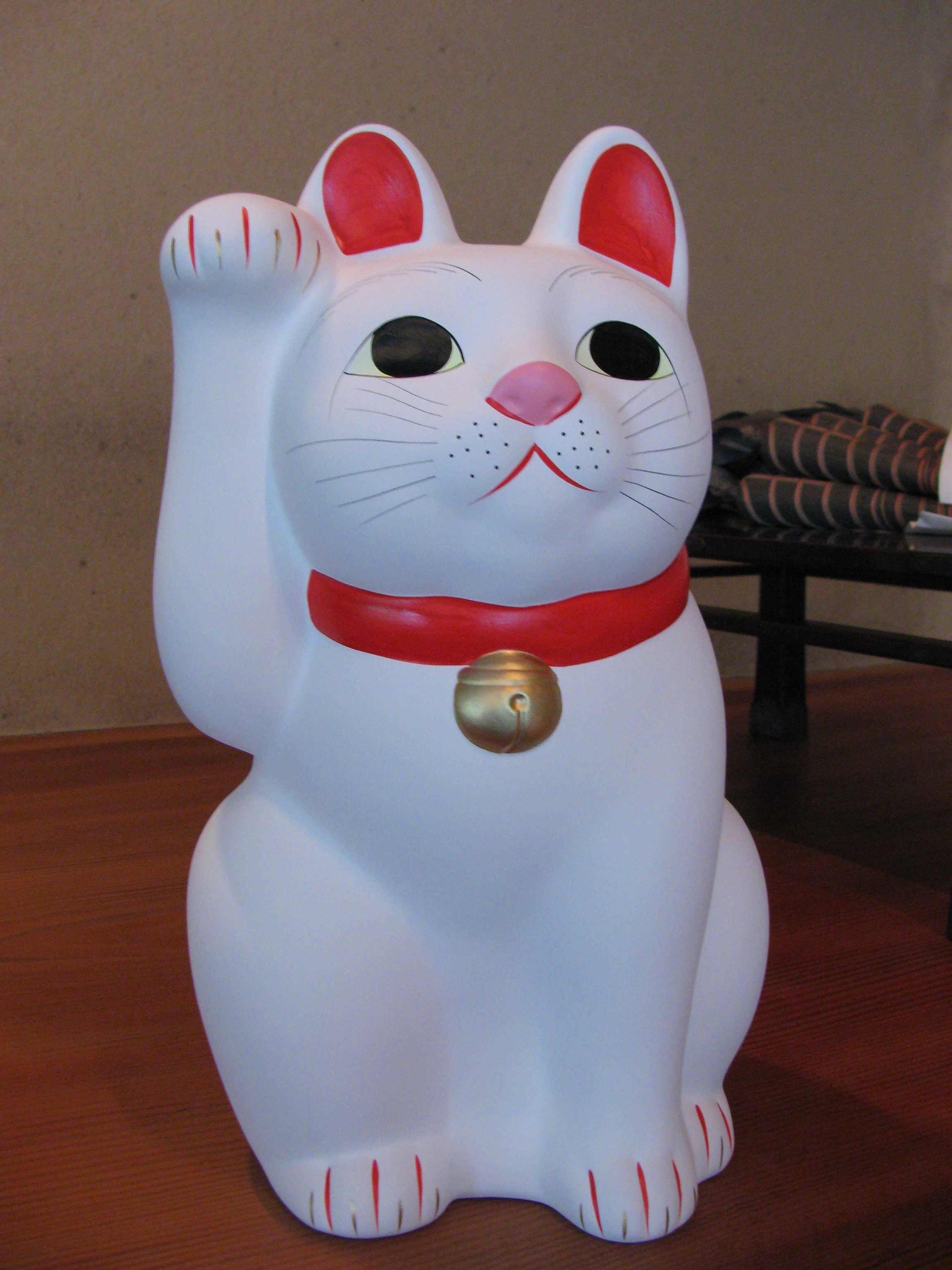 右手を挙げている猫は金運を招き、左手は人(客)を招きます。