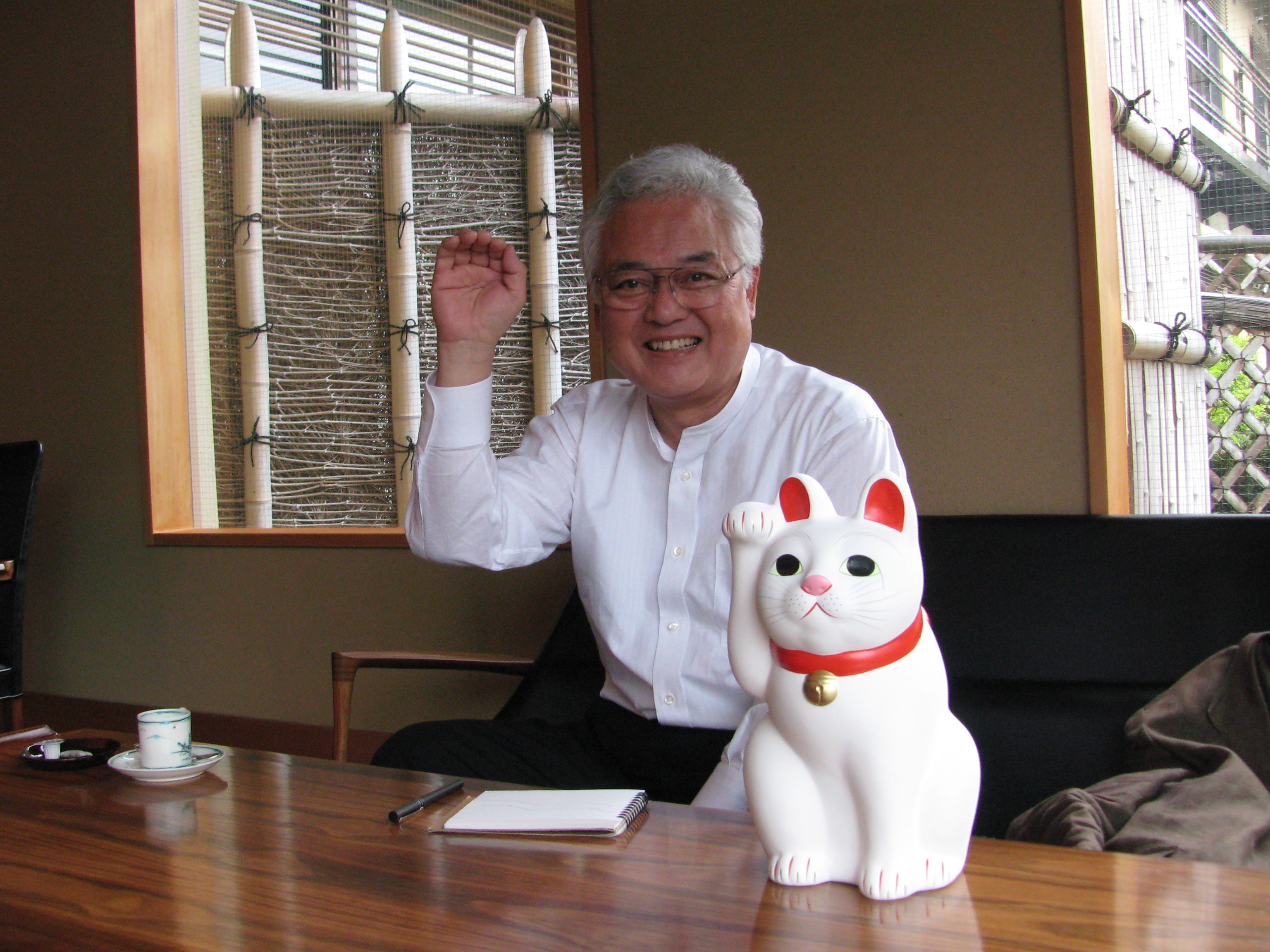 先生も猫と一緒に右手をあげてます