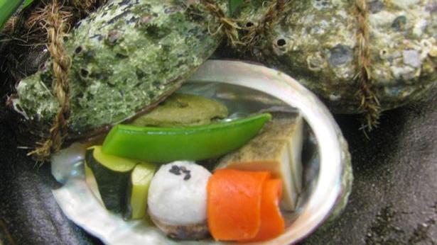前菜は鮑の殻盛り