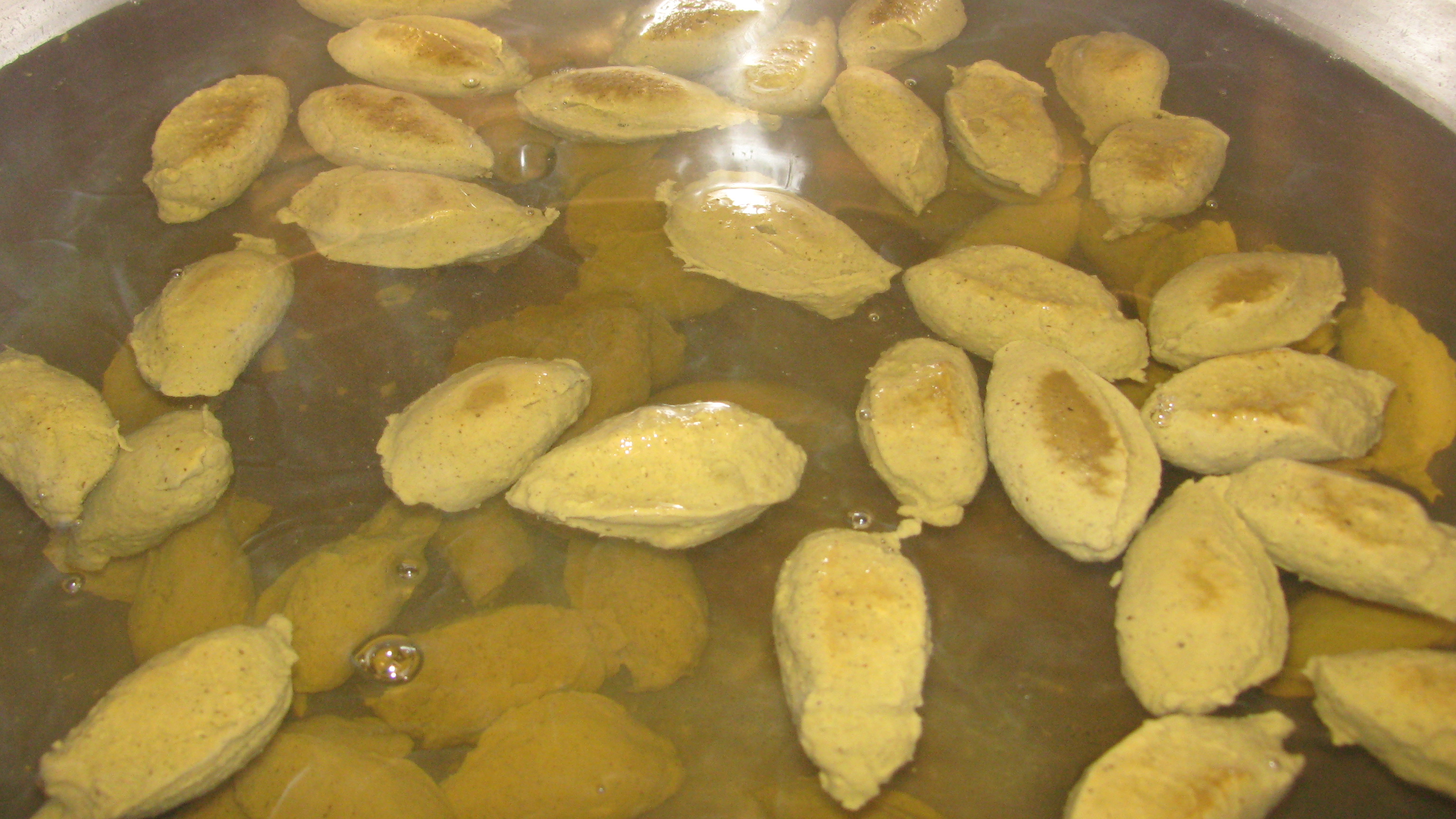 を混ぜ、茹でます。)