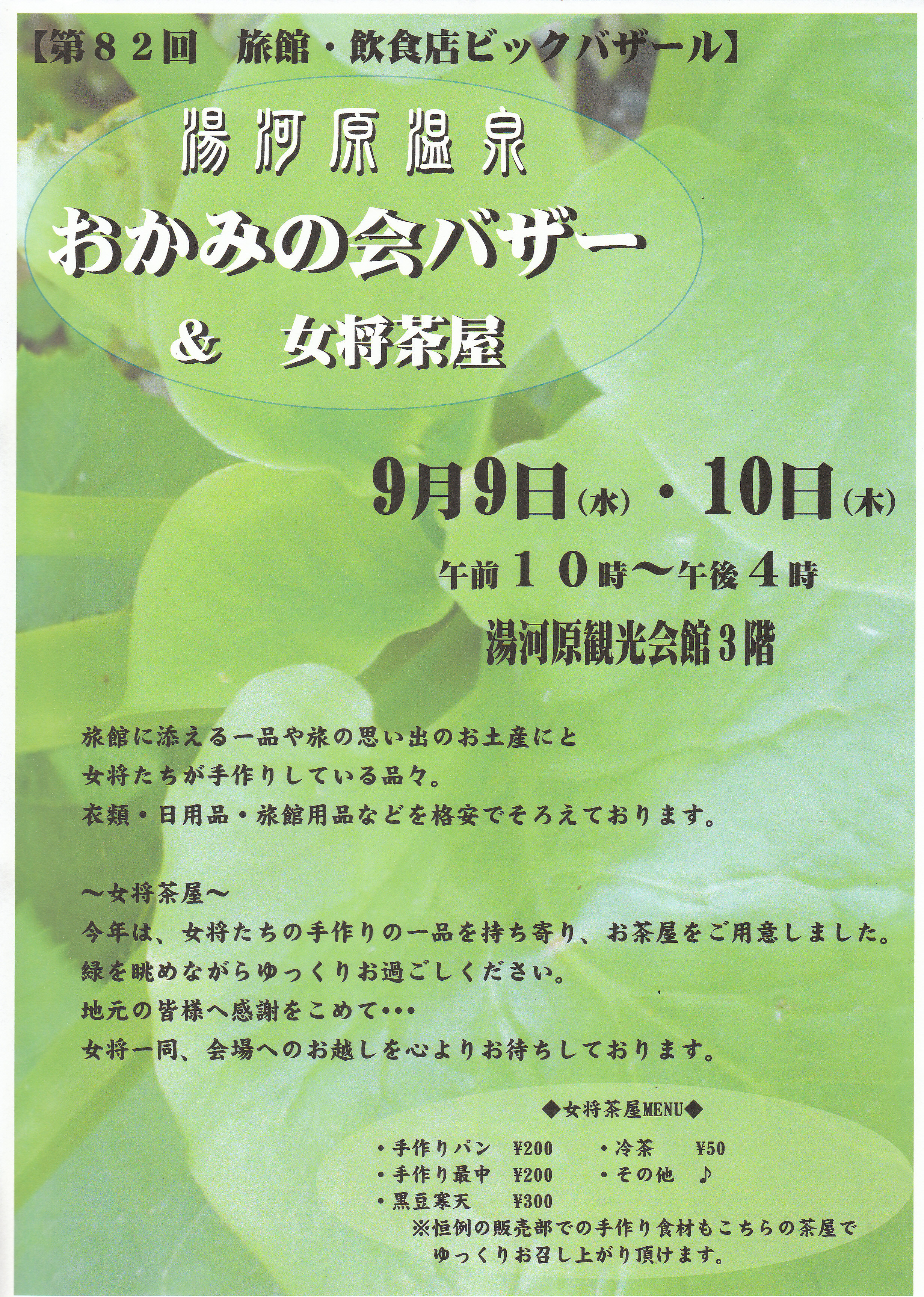 9月9日・10日 10時~4時まで 湯河原観光会館3階にて おかみの会バザー&女将茶屋があります バザーに向けて今日は光陽館さんで 寝付けや打ち合わせがありました。 素敵な品物も沢山あり 楽しい作業でした。 今回は喫茶部門もあります。 皆様、是非お出かけになって下さいませ